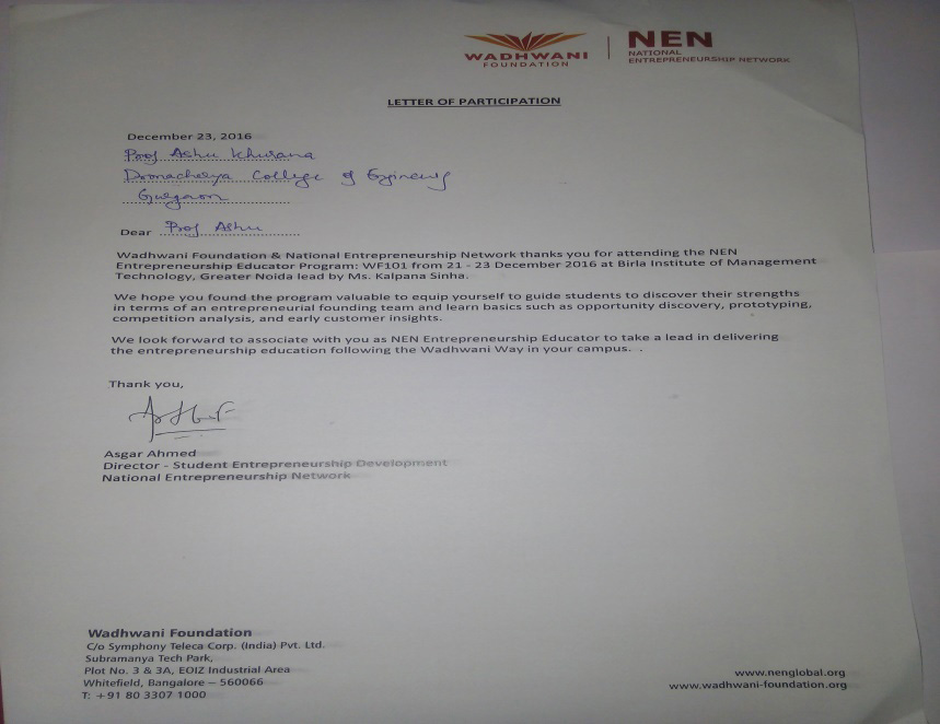 The session started with the Welcome Address by Mrs. Sanya Singh, Consultant, NEN. The session was co-conducted by Mrs. Kalpana Sinha, Consultant, NEN. Mrs. Sinha briefed the audience about the three days Entrepreneurship Educator Program and explained the need of Entrepreneurship based education along with its importance in Academic areas. She emphasized on the fact that Entrepreneurship Educator Program is the key driver of the Indian economy. |