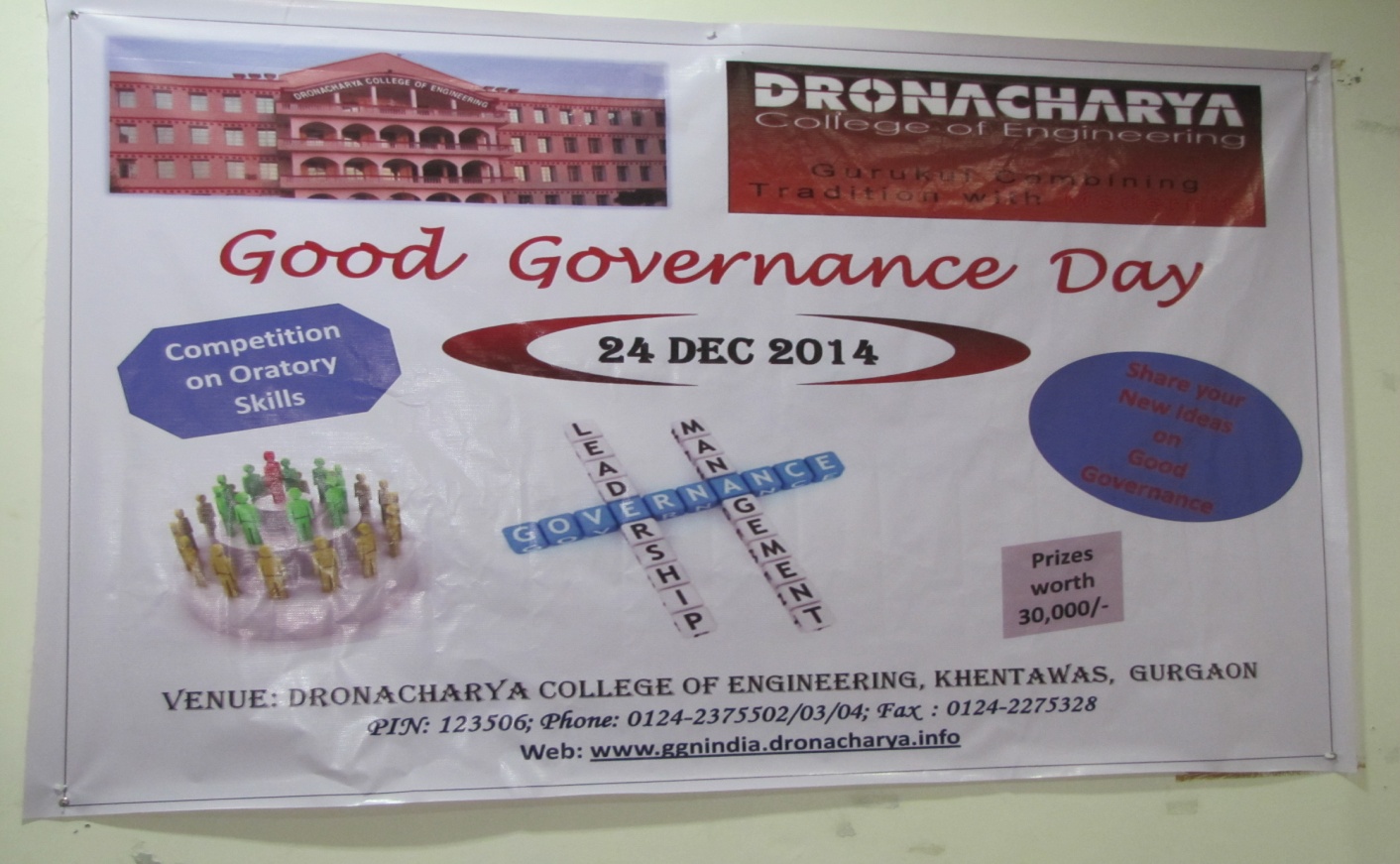 Amar Saraswat of Computer Science department shared his views related with Good Governance and how e-governance can contribute in the good governance of our country. He spoke on length on various e-resources available for the citizens and government to use for good governance. His address was followed by Priyanka Mahani of ECS department, she talked about G2C, C2G, G2G and G2B models of governance where G represents Government, C represents Citizens and B represents Business. |